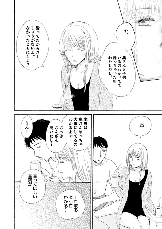 最後のコマの雰囲気がすごく良い感じでした。そこから逆算して、この女の子と主人公の男性の嫁との高校時代のエピソードを1個入れるだけでだいぶ変わる。しみじみ終わるということもできたのになと。あるいは、真実告げられて逃げてく旦那をロングで描けばサスペンス仕様。いろんな可能性があったのに、辿り着けてないのがもったいないです。あと全体に言葉で説明しすぎですね。絵は正直、一応かわいい、という感じでエロも弱いんですけど、こうすればいいのにな、っていう感想が出てくるということは、駄目じゃない、惜しいということ。いっぱい描いてほしいですね。もうひと捻りすればぜんぜん変わる人のような気がします。